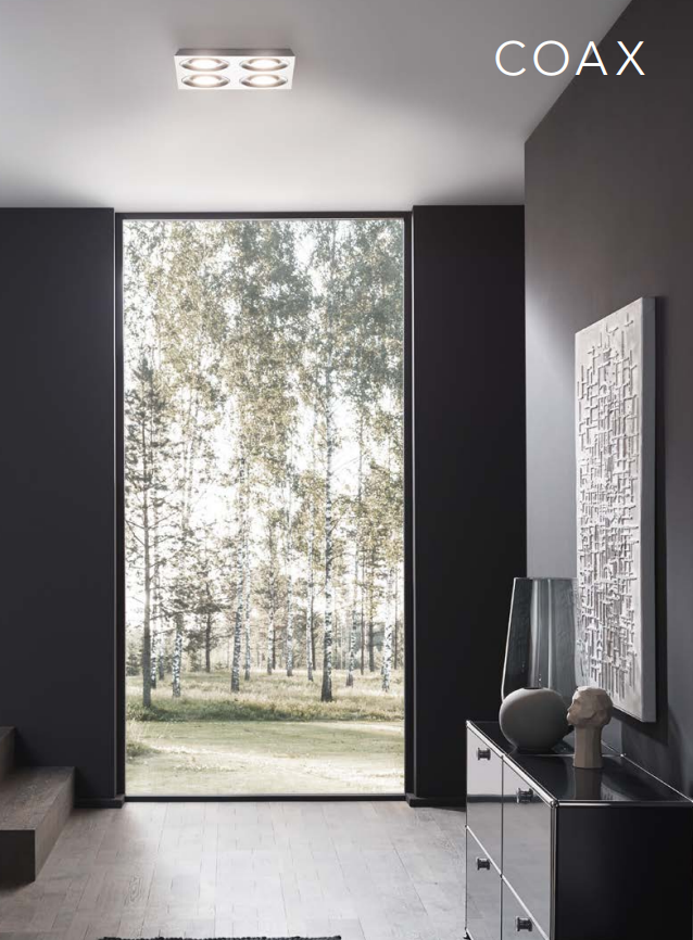 | Für Decke oder Wand, als Grund- oder Akzentbeleuchtung, in Schwarz oder Silber: COAX integriert sich in jedes Raumkonzept. Pro Modul umschmeichelt ein veredelter Aluminium-Ring die Lichtoptik der außergewöhnlich flachen Leuchte. Zwei, drei oder vier Lichtoptiken in einer Reihe bilden horizontal oder vertikal eine gestalterische Einheit. Alternativ bringt ein quadratisches Multiple gezielt Licht ins Dunkel. |